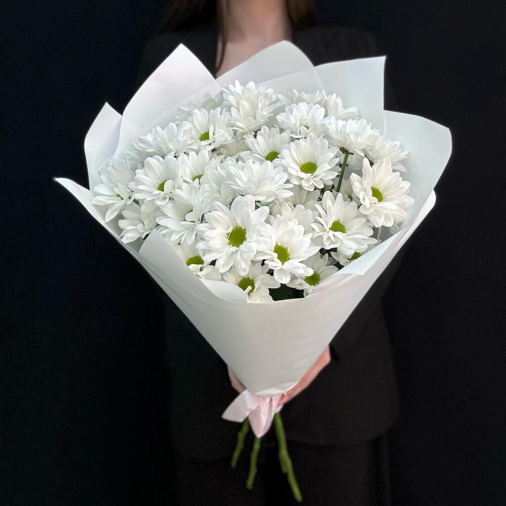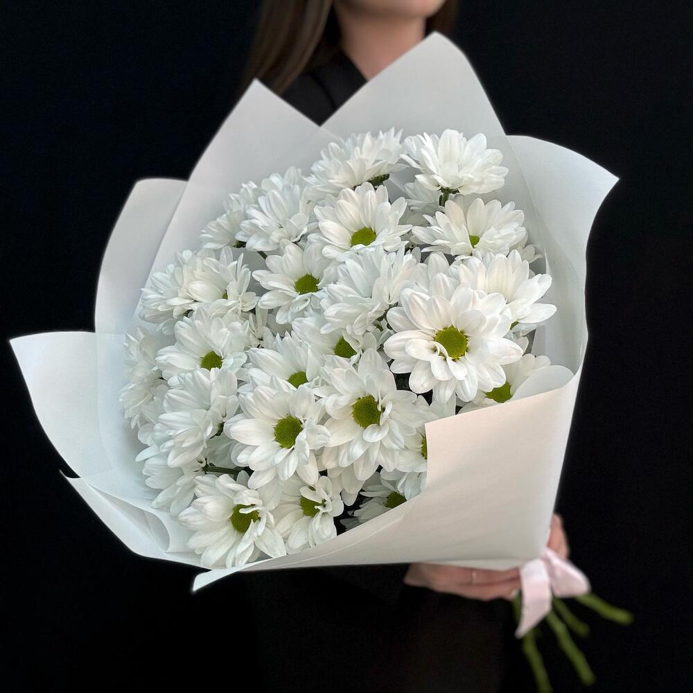 Хризантема кустовая - 5 шт. Лента атласная - 1 шт. Упаковка дизайнерская - 1 шт.